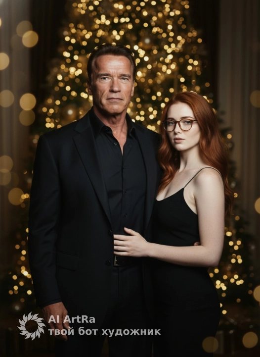 This prompt must be applied to the people in the photo. Important: Do not change or distort faces. Do not alter facial expressions. Faces must be preserved completely, as in the original photos. Use the facial features and likeness from the provided reference images. Generate the scene around them, but keep their faces identical. Prompt: A portrait of a couple dressed in business attire standing close together with the man looking down and the woman looking tenderly over his shoulder. Medium shot, close composition, dynamic interaction between objects, focus on the upper body. The man is wearing an elegant, tailored black jacket over a black button-down shirt, black trousers, and a black belt. The woman is wearing a chic black dress with spaghetti straps. The woman stands slightly behind the man and puts her arm around him. Indoors, the setting is luxurious and dark, with a large, out-of-focus Christmas tree in the background, decorated only with warm, shimmering gold garlands, creating a strong bokeh effect. Dramatic, subdued lighting with the main light subtly highlighting the couple's faces and the texture of their clothing, contrasting sharply against the dark background. The light creates rim lighting and emphasizes the texture. Shot with an 85mm portrait lens, very shallow depth of field, with warm golden highlights predominating, high resolution, photorealistic, high detail.