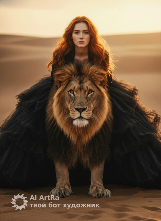 кадр завораживающий и напряжённый в тёплом свете пустыни на закате. Женщина с длинными развевающимися на ветру волосами,сидит за крупным львом,её тело слегка наклонено вперёд, руки спрятаны за пышной гривой льва.Ее взгляд направлен в камеру,решительный и уверенный.Она одета в роскошное чёрное платье с пышной, многослойной юбкой, эффект воздушности,видна фактура ткани и подчеркивают контраст с песчаным фоном. Открытое декольте. Лев обладает густой, чёрно-коричневой гривой, его выразительные глаза устремлены вперёд, тело массивно и внушительно, лапы отчётливо стоят на песке, фиксируя свет и тени на шерсти. Свет падает с фронтальной стороны на женщине, и на льве, создавая тонкую игру теней на тканях и шерсти. Задний план пустыни размыт придаёт глубину и фокусирует внимание на главных персонажах, присутствует гармоничный баланс между оттенками песка и глубокими тонами одежды и гривы, что создаёт атмосферу спокойствия и величия одновременно.Взгляд женщины таинственный и сильный. Максимально сохранить черты лица.