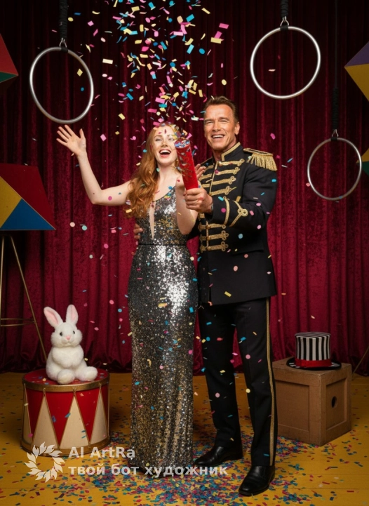 Используйте внешний вид пользователя, референса 1:1 — лицо, кожу, волосы и тело без каких-либо изменений. Сцена праздничного циркового шоу с двумя персонажами, стоящими в центре композиции на фоне бордовых бархатных штор, оживленных падающим разноцветным конфетти в оттенках розового, голубого, желтого и зеленого; мужчина держит в руках красный пистолет для конфетти, женщина поднимает ладони с ярко-красным маникюром, оба излучают радость. Окружение дополнено цирковыми атрибутами: белым плюшевым кроликом на красном подиуме, полосатым цилиндром, геометрическими фигурами и кольцами для трюков. Стиль — высокодетализированная фотография с ярким студийным освещением, создающим глубокие блики на блестящем платье женщины и текстурах костюмов; композиция выполнена в среднем плане с фронтальным ракурсом, акцентируя динамику падающих конфетти и эмоциональные жесты. Атмосфера — взрывная, игривая, с нотками ностальгического циркового представления, подчеркнутая теплым желтым полом и насыщенными контрастными цветами декораций.