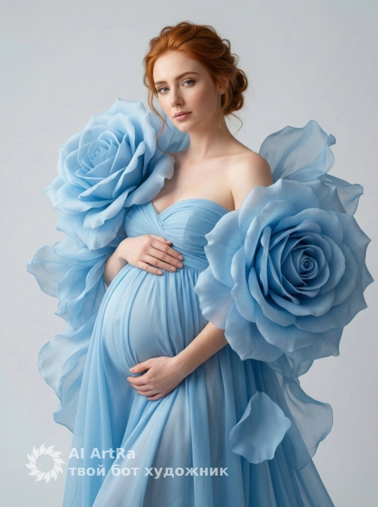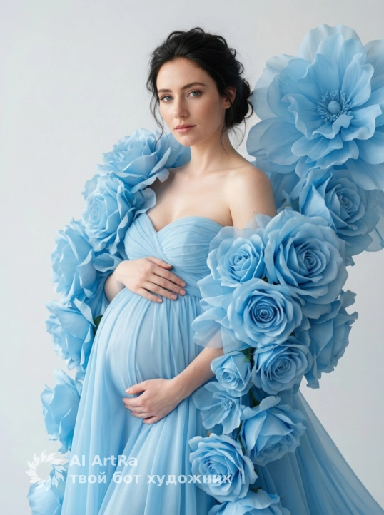 Создай фотографию, не изменяя черты лица. Элегантная беременная женщина, портрет, студийная съемка, мягкий свет, наряд, гипертрофированные огромные цветы, пышные розы, небесно-голубой цвет. Обнимает живот, убранная прическа, нежность, материнство, гламур, высокое качество, fashion-фотография, фотостудия, 8К, high fashion look. Элегантный портрет в студии. Женщина на позднем сроке беременности (третий триместр) с небрежно собранными в пучок волосами. Стоит, смотрит в камеру, держа руки на округлившемся животе, с нежным, любящим выражением лица. Платье-бандо (без бретелей) из струящегося, воздушного, небесно-голубого материала. Главный акцент — огромные, гипертрофированные, объемные цветы из того же материала, обрамляющие ее плечи и тело, создавая эффект «облака из лепестков». Свет мягкий, рассеивающий, теплый, студийный. Фон чистый, минималистичный, светло-серый или белый. Настроение: нежность, изысканность, гламур, чистота материнства.