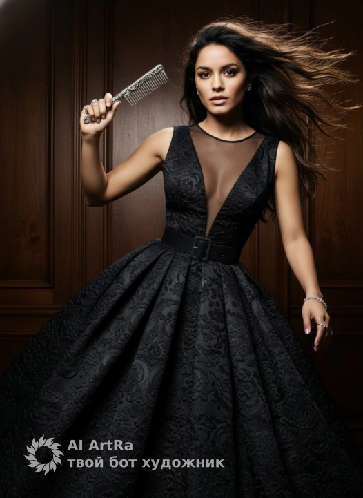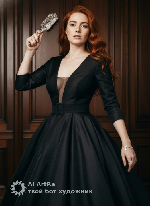 Используйте внешний вид пользователя, референса 1:1 — лицо, кожу, волосы и тело без каких-либо изменений. Динамичная композиция с женщиной в элегантном чёрном платье с глубоким V-образным вырезом и полупрозрачной вставкой на груди, дополненном широким поясом на талии и объёмной юбкой из фактурной ткани; в правой руке — роскошная расчёска с серебристой резной ручкой, левая рука вытянута вперёд с акцентом на изящные украшения: кольцо-крест и браслет с подвесками; фон из тёмных деревянных панелей с текстурой, напоминающей старинную мебель, создающий атмосферу роскошного винтажного интерьера; освещение контрастное, с яркими бликами на волосах и деталях одежды, подчеркивающее движение и объём; ракурс с лёгким наклоном камеры, усиливающий динамику сцены, где развевающиеся волосы и поза передают энергию и смелость; стиль — гиперреалистичная модная фотография с акцентом на детали ткани, блеск аксессуаров и глубину цветовой палитры, сочетающей тёмные оттенки с тёплыми деревянными акцентами.