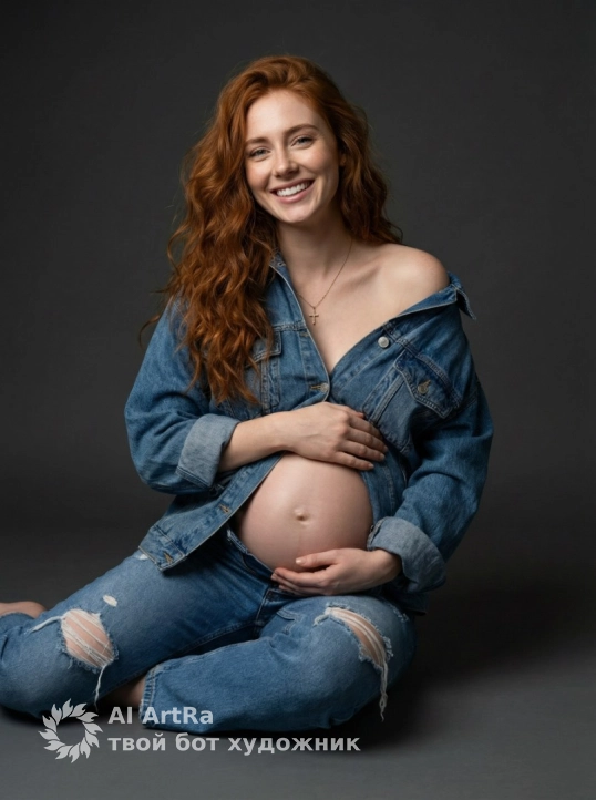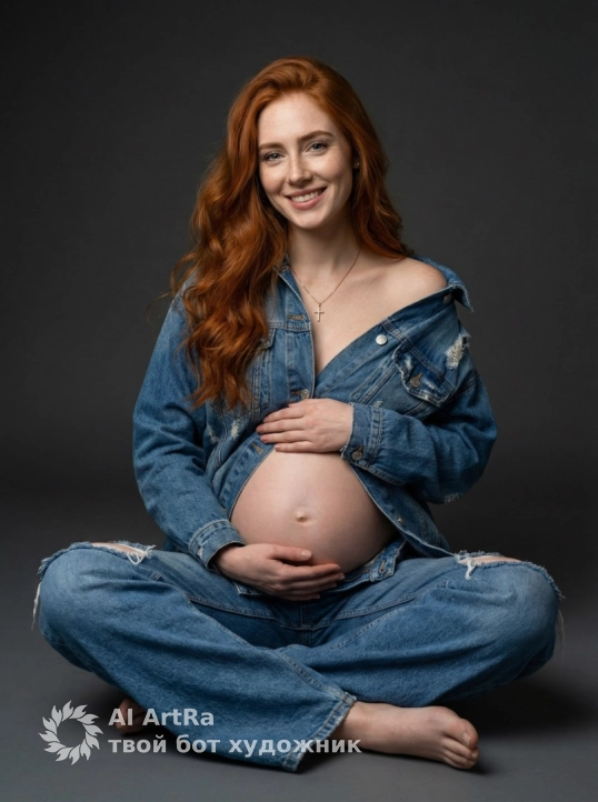 Создай портрет, не изменяя черты лица. Стильный студийный портрет беременной женщины в полный рост. Она сидит в расслабленной позе на студийном полу, обнимая свой обнаженный округлившийся живот. На ней модный образ в стиле «стрит-шик» или «деним-на-деним»: объемные голубые рваные джинсы с высокой талией, спущенные и расстегнутые, и объемная голубая спущенная с плеч джинсовая куртка. Длинные, волнистые, взъерошенные волосы, яркая улыбка, естественный макияж, золотой крестик на шее. Фон минималистичный, темно-серый, с мягким студийным светом, создающим тени и блики на коже и одежде. Качество: высокое разрешение, кинематографическое освещение, мягкий свет. Элегантный образ материнства, передающий ожидание и силу деталей, студийное освещение, 8К.