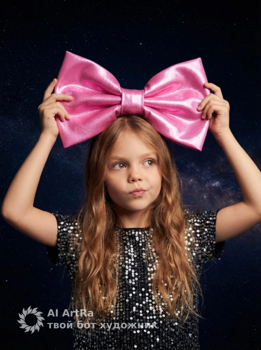 Не меняя внешности человека с фото, на фоне глубокого тёмного пространства, словно погружённого в атмосферу ночного таинственного пространства, юная девушка с длинными, волнистыми, светло-каштановыми волосами, плавно ниспадающими на плечи, приподнимает к голове огромный, отражающий свет ярко-розовый бант из блестящего материала. Её взгляд устремлён чуть вверх и в сторону, губы слегка поджаты в едва заметном выражении задумчивости или лёгкого удивления, что придаёт образу живость и эмоциональную глубину. Девочка одета в чёрную кофту, усеянную множеством блестящих серебристых пайеток, которые при искусственном освещении создают мерцающий эффект, словно маленькие звёздочки на ночном небе. Свет падает мягко и равномерно, подчёркивая текстуры пайеток и придавая объём прядям волос, создавая плавные тени и световые блики, которые усиливают атмосферу загадочности и торжественности. Поза динамична и немного игрива, руки подняты к голове, держащие бант с обеих сторон, что в сочетании с направлением взгляда наполняет сцену лёгкостью и живостью. Контраст ярких цветов и текстур подчёркивает главные акценты образа, оставляя при этом всё самое важное — индивидуальные черты и эмоциональное состояние — в полном сохранении. Общее настроение кадра выдержано в стиле изысканной современной фотографии с элементами кинематографической глубины, где сочетание света и тени подчёркивает важность момента и подчёркивает естественную красоту и непосредственность девушки, фотореалистичное изображение, высокая текстурная детализация, высокое качество, разрешение 4K.