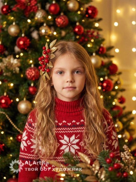 Не меняя внешности девочки с фото, перед нами предстает образ, наполненный атмосферой уюта и праздничного ожидания. Она стоит перед красиво украшенной елкой, на которой сверкали яркие красные и золотистые шары, создающие живую игру света и мягких бликов, которые изгибаются и пульсируют в пространстве благодаря рассеянному свету гирлянд. Девочка смотрит прямо в камеру, ее взгляд спокойный и одновременно полный внутренней теплоты и невинного любопытства. Ее густые, волнистые волосы свободно спадают на плечи, демонстрируя естественный блеск и структуру, а одна сторона украшена декоративным элементом из золотистых листьев и ярко-красных ягод, что придает образу праздничную изысканность и подчеркивает связь с рождественской тематикой. На ней уютный вязанный свитер насыщенного красного цвета с высоким воротником, украшенный традиционным узором снежинок и других зимних мотивов белого цвета, которые контрастируют с основным тоном и добавляют текстурной глубины. Свет тщательно рассчитан так, что он мягко освещает лицо девочки и выделяет его на размытом фоне, преисполненном теплых желтых и белых свечений, создавая чувство тихого зимнего вечера, напоенного ожиданием чуда. Тени сглажены, но в то же время сохраняют объемность, что придает фотографии насыщенную кинематографичность и живую реалистичность, словно кадр из теплой семейной истории. Вся композиция построена так, чтобы не отвлекать внимание от лица ребенка и его естественной красоты, одновременно создавая визуальный диалог с декоративной растительностью, которая слегка заслоняет нижнюю часть кадра, придавая сцене глубину и ощущение нахождения в уютном домашнем пространстве. Все детали — от текстуры нити свитера до нежных локонов и мерцающего света — отобраны с предельной точностью, что в совокупности формирует чарующее, проникновенное фотореалистичное изображение, высокая текстурная детализация, высокое качество, разрешение 4K.