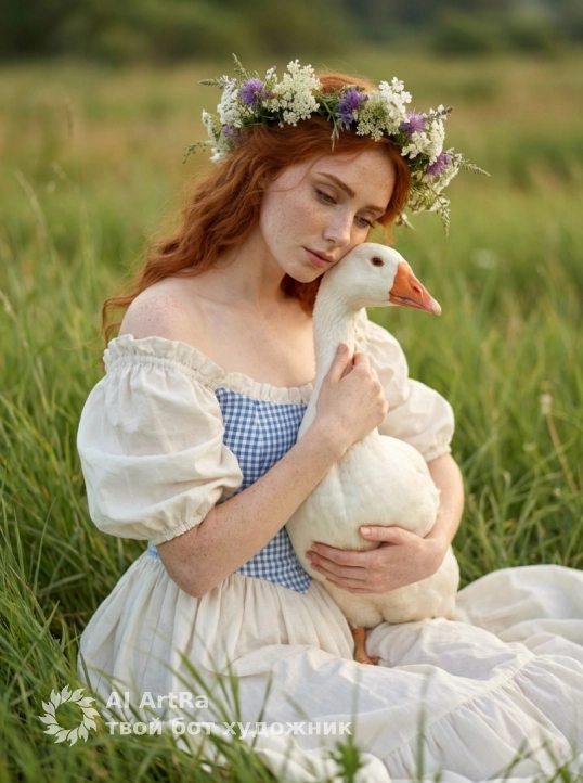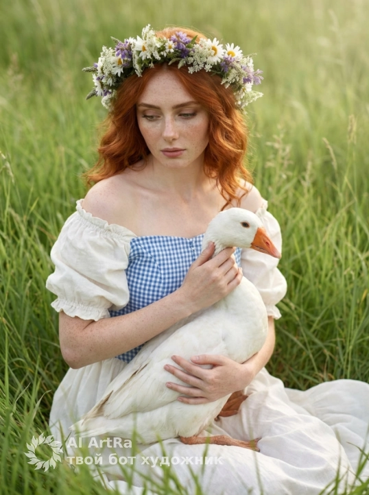 Используйте внешний вид пользователя, референса 1:1 — лицо, кожу, волосы и тело без каких-либо изменений. На изображении — женщина в нежном, романтическом стиле, сидящая в высокой зелёной траве на фоне мягкого, рассеянного солнечного света, создающего атмосферу умиротворения и сказочной нежности; на голове — венок из белых и фиолетовых полевых цветов, аккуратно сплетённый с зеленью; макияж естественный, с акцентом на розовые губы и слегка подведенные глаза; маникюр отсутствует, ногти естественной длины и формы; украшений нет; она держит на руках белого гуся с оранжевым клювом, ласково прижимая его к себе, взгляд направлен вниз, с выражением нежности и задумчивости; одежда — пышное платье в стиле прованс или фольклорной деревенской моды, с открытыми плечами, пышными рукавами и сине-белой клетчатой вставкой на лифе; камера снята с лёгким ракурсом сбоку и немного сверху, фокус на лице и гусе, фон размыт, что подчеркивает глубину и объём; стиль — высокореалистичная цифровая фотография с художественной обработкой, напоминающей живопись, с теплой цветовой палитрой, золотистыми оттенками и мягкими тенями; композиция — центральный объект слегка смещён вправо, создавая динамичный баланс; масштаб — средний план, от пояса вверх, с акцентом на взаимодействие с птицей; атмосфера — сказочная, поэтичная, спокойная, с намёком на мечтательность и единение с природой.