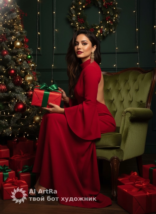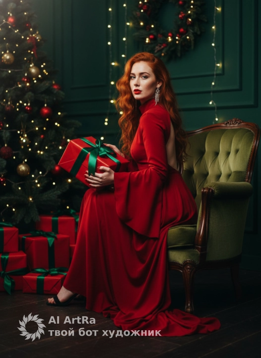 A woman sitting sideways in a plush green armchair, holding a red Christmas present with a green ribbon, looking at the camera. Full-length, low-angle shot, dynamic composition. Makeup with an accent on bold red lips. A long, open-back evening gown in a rich red color with a high collar and long flared sleeves, black high-heeled sandals, long statement dangle earrings. Festive Christmas setting, dark green wall with wreaths of fir branches and garland, a decorated Christmas tree on the left, many red presents on the floor, a vintage green velour armchair. Warm, dramatic, cinematic lighting: backlighting from a string of lights on the wall, soft side lighting, deep shadows. Photorealistic style, shot on an 85mm portrait lens, shallow depth of field, highly detailed, rich color palette with dominance of red and dark green.