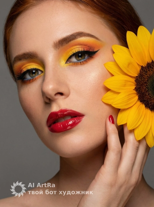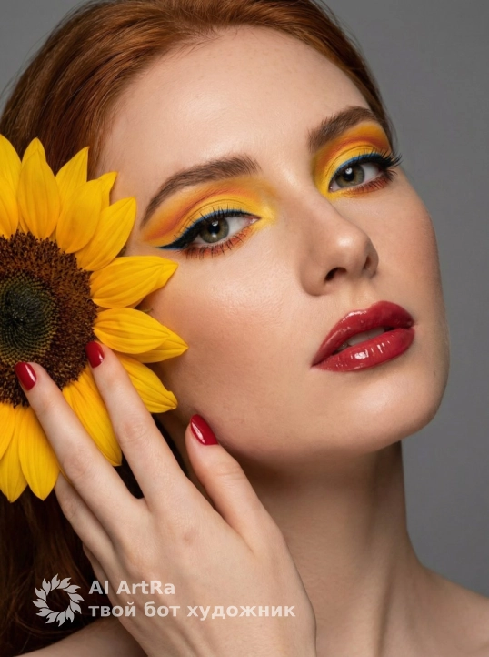 A close-up, artistic portrait of a woman. Her vibrant makeup includes bold yellow and orange eyeshadow, complemented by crisp black eyeliner, a thin blue line, and mascara. Her lips are glossy, a rich red, and her skin is matte. A sunflower with bright yellow petals partially frames her face, resting near her ear. Her right hand gently caresses her cheek and the sunflower, her nails painted red. Soft highlights and shadows are visible on her face. She looks at the camera, her head slightly tilted. The background is a solid gray.
