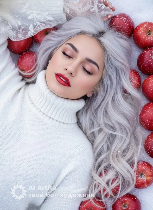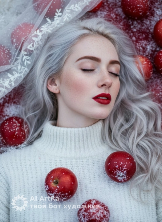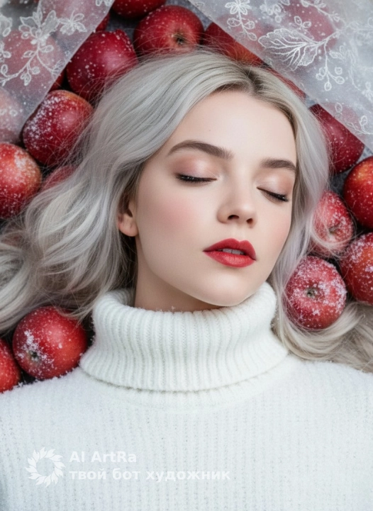 Не меняя внешности женщины с фото, перед нами величественный и нежный зимний портрет. Молодая женщина с закрытыми глазами, словно в глубоком сне, покоится среди ярко-красных сочных яблок, которые создают контраст с её светлой кожей и платиновыми локонами волос. Её волосы свободно раскинуты вокруг головы, тонкими, мягкими волнами спускаются по снежной поверхности, на которой рассыпаны кристаллы инея, придавая композиции холодную хрупкость и воздушность. Тонкая текстура свитера из плотной белой пряжи с высоким воротником уютно обнимает шею, а прозрачная, частично обрезанная кадром в верхней части, ткань с вышивкой нежно смотрится на фоне мягкого света, который падает сверху справа, мягко подсвечивая скулы и шелковистую поверхность кожи. Образ девушки наполнен спокойствием и умиротворением, губы светятся ярким красным цветом, добавляя драматичности и экспрессии, при этом их текстура ясна и четка, контрастируя с матовостью белого свитера и меловой белизной инея. Свет мягко обволакивает лицо, выделяя тонкий контур носа и губ, но оставляя веки немного затемненными, что усиливает ощущение сна. Фон наполнен дерзким алым цветом яблок, которые вдалеке теряются в расплывчатой красочной массе, добавляя глубину и объем всей сцене. Вся композиция дышит зимней сказкой с оттенком драматичной нежности, идеальным сочетанием холода и тепла в кадре, словно момент застывшей магии и красоты природы. фотореалистичное изображение, высокая текстурная детализация, высокое качество, разрешение 4K.