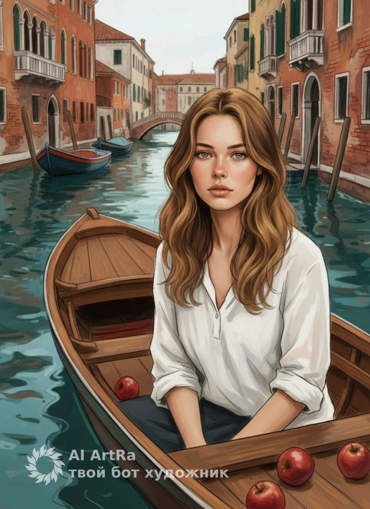 Using the provided reference photo for exact facial features and likeness: A powerful and atmospheric digital illustration with a raw, hand-drawn feel. A chestnut-haired woman with a strong, expressive face sits in a classic wooden boat in a Venetian canal. She wears a simple white shirt. Her contemplative expression tells a story. The style is reminiscent of a cinematic graphic novel; lines are loose and expressive, colors are rich but moody, with deep teal, terracotta, and ochre tones. The water of the canal is rendered with expressive brushstrokes. A few apples are visible in the boat. The focus is on the character's emotion and the narrative atmosphere of the scene. The mood is poetic, introspective, and visually striking.
