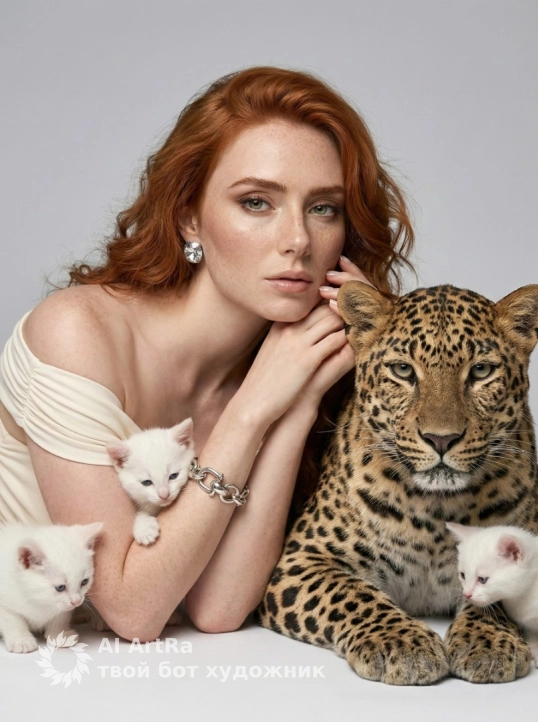 Используйте внешний вид пользователя, референса 1:1 — лицо, кожу, волосы и тело без каких-либо изменений, с естественным, сияющим макияжем: акцент на гладких, слегка подведённых глазах с тонким металлическим оттенком, ровными бровями, едва заметной румянцем на скулах и нюдовыми губами с лёгким блеском; маникюр — короткие, аккуратно отполированные ногти с прозрачным или матовым покрытием; украшения — крупные серебристые серьги-гвоздики с гранёной поверхностью и массивный браслет-застёжка из металла на левом запястье; главный объект — женщина в позе лежа на животе, голова опирается на руки, рядом с ней — лежащий леопард с расслабленным выражением морды и тремя белыми котятами, один из которых прижимается к её руке; художественный стиль — гиперреализм с элементами студийной фотосъёмки, мягкая цифровая обработка; фон — однотонный светло-серый, без текстур, с лёгким градиентом; освещение — мягкое, студийное, с боковым источником света слева, создающим нежные блики на коже, шерсти и лепестках; цветовая палитра — пастельные розовые, кремовые и золотистые тона, контрастирующие с тёмными пятнами леопарда; композиция — центральный ракурс, симметрично-уравновешенная, с акцентом на взгляде женщины и леопарда; объект расположен в центре кадра, с лёгким наклоном вправо; масштаб — средний план, от плеч до середины предплечий; атмосфера — спокойная, загадочная, с нотками дикой элегантности; одежда — открытый плечами кремовый топ с драпировкой, создающий эффект легкости; поза — расслабленная, с опущенными плечами, руками, сложенными под подбородком, взгляд направлен прямо в камеру с лёгкой задумчивостью.