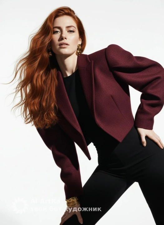 Сохрани то же лицо (не менять черты, идентичность). Ultra-high-end fashion editorial. Женщина в динамичной позе, чуть наклон вперед, элегантность и сила. Роскошный глубокий бордовый жакет с объемными рукавами из плотной фактурной ткани, свет дает скульптурные тени. Под ним черный облегающий наряд, подчеркнутая талия и бедра. Золотые серьги и браслеты, яркие блики. Волосы волнистые, слегка растрепанные, частично закрывают плечи и лицо, киношная драма. Светлый почти белый фон, сильный контраст, минимализм и роскошь. Мягкий направленный свет, глубокие тени, выделение текстур. Стиль: ультра-реализм, 4K, VOGUE-уровень. Do not alter face, skin tone, тело, этничность. Только свет, фон и текстуры.