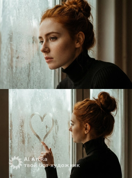 Нижняя часть: та же девушка с той же прической в той же одежде, рисует на окне сердце пальцем