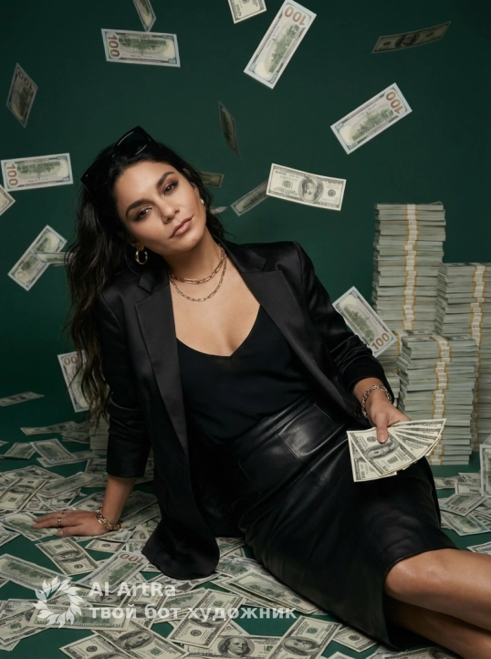 Masterpiece, best quality, ultra-detailed, photorealistic, full-body portrait. A woman from photo with flawless skin and a serene, confident expression lies back, surrounded by a dynamic storm of one-hundred-dollar bills falling and floating in the air. She wears a tailored black silk blazer left open over a matching camisole, paired with a sleek black leather pencil skirt. Her hair cascades around her. Stylish, oversized black sunglasses are pushed up, resting casually in her hair, not on her face. Her accessories are luxurious gold: multiple delicate chain necklaces of varying lengths, statement hoop earrings, and several slim bracelets on her wrist. Towering, neat stacks of bound one-hundred-dollar bills rise in the background. The floor is a dense carpet of bills, and in one hand, she holds a fan of bills. The scene is set against a deep green background. Cinematic, moody lighting with strong highlights illuminates her, the crisp white bills, her dark attire, and the warm glow of the gold jewelry, creating deep shadows and a powerful sense of depth and motion. Style: High-end fashion editorial, Vogue-style, opulent surrealism. Shot on a medium format camera, 8K resolution.