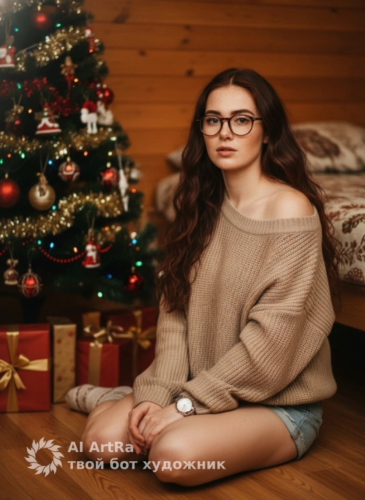 Не меняя внешности женщины с фото, кадр запечатлевает молодую женщину, сидящую на деревянном полу у украшенной рождественской ели в уютной комнате с деревянными стенами, придающими сцене теплую, домашнюю атмосферу. Она расположилась на коленях, слегка развернув корпус в сторону камеры, держа руки аккуратно сложенными на коленях. Взгляд женщины направлен прямо в объектив, излучающий мягкую задумчивость и спокойствие. Большие, выразительные глаза подчеркнуты деликатным макияжем, а длинные тёмные волосы свободно ниспадают волнами на плечи и спину, отдельные пряди плавно отражают свет. Женщина одета в объемный, рыхлый свитер бежевого цвета с расущенной одной стороной плеча, открывая кожу, что добавляет снимку небрежной элегантности и интимности. Рукав свитера зажат на запястье, где заметны часы с металлическим браслетом, придающие образу современный акцент. Низ образа контрастирует с верхом — короткие джинсовые шорты, обнажающие стройные ноги, на которые надеты светлые носки с рисунком. Елка рядом украшена множеством игрушек — красочные шары, фигурки и сверкающие гирлянды, создавая праздничное настроение, а под ней аккуратно разложены подарочные коробки в красной и золотой упаковке с лентами. Фон частично затемнён деревянными стенами и уголком кровати, покрытой тканью с пестрым узором, добавляющей глубину и уют композиции. Освещение мягкое, направлено преимущественно спереди слева, создавая нежные тени, которые моделируют объем женщины и текстуры свитера, делая всю сцену живой и атмосферной, проникнутой легкой ностальгией и ожиданием праздника, фотореалистичное изображение, высокая текстурная детализация, высокое качество, разрешение 4K.