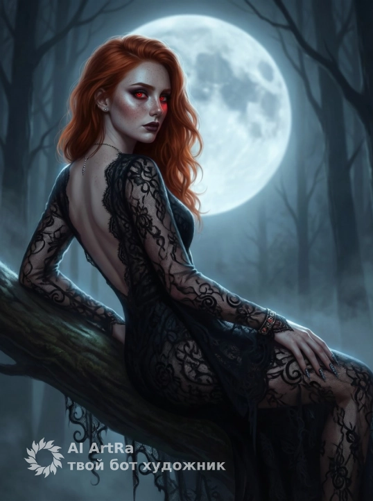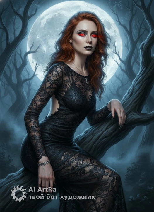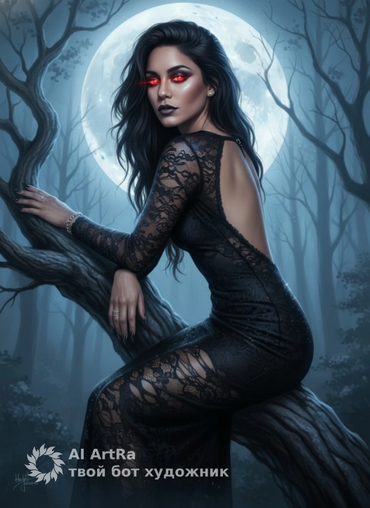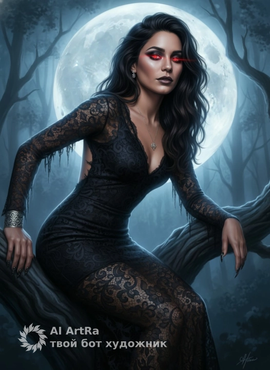 Используйте внешний вид пользователя, референса 1:1 — лицо, кожу, волосы и тело без каких-либо изменений. На лице — драматичный макияж с глубокими тенями, подчеркивающими глаза, и насыщенным тёмным контуром губ; глаза горят ярко-красным свечением, создавая мистический эффект. На пальцах — длинный, острый маникюр с тёмным лаком, возможно, с блестками или глиттером. Украшения: тонкое ожерелье с подвеской, серьги-гвоздики и браслет на запястье с декоративными элементами. Главный объект — женщина в позе полусидя на толстой ветви дерева, слегка наклонившись вперёд, с рукой, опирающейся на ветку, и другой, свободно свисающей вниз. Одежда — облегающее платье из чёрного кружева с открытой спиной и длинными рукавами, прозрачными на участках, с рваными краями и декоративными завитками. Художественный стиль — гиперреалистичная цифровая живопись с элементами фэнтези и готики. Фон — туманный лес ночью, с силуэтами деревьев и огромной светящейся луной за спиной, создающей контровое освещение. Освещение — холодное, синевато-серое, с акцентом на красное свечение глаз и блики на кружеве; цветовая палитра — тёмно-синяя, чёрная, с оттенками серого и яркими акцентами красного. Композиция — средний план, ракурс снизу вверх, камера слегка смещена вбок, акцентируя силуэт и позу. Атмосфера — мистическая, загадочная, немного угрожающая, с ощущением древней магии и одиночества.