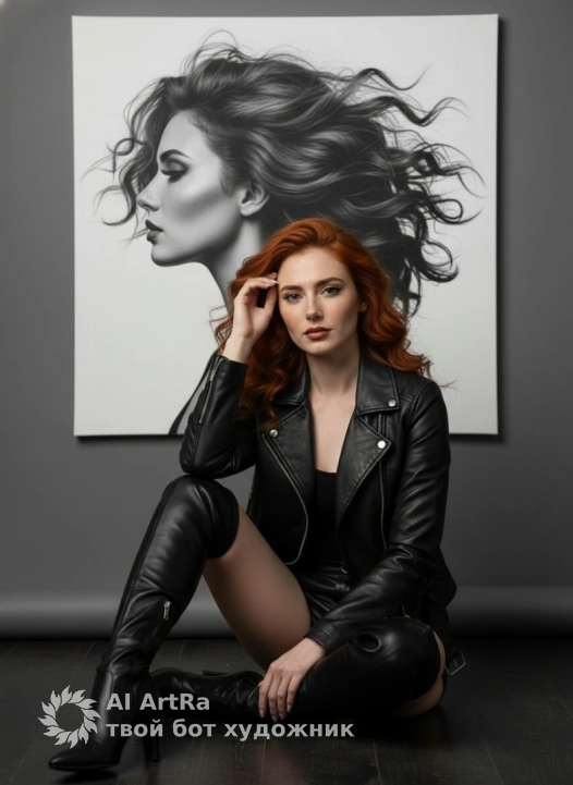 Фон — простой, однородный средне-серый. Непосредственно за ней — большой прямоугольный холст, на котором изображен черно-белый (монохромный) профиль той же женщины, с ее волосами, эффектно развевающимися на ветру. Освещение — профессиональный студийный мягкий свет с четкими бликами на коже и коже. Высокомодный портрет, студийная съемка, ультрадетализация, фотореалистичность, подчеркивающая контраст между яркой сидящей женщиной и ее эффектным монохромным отражением.