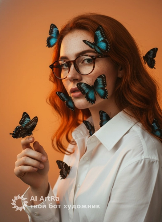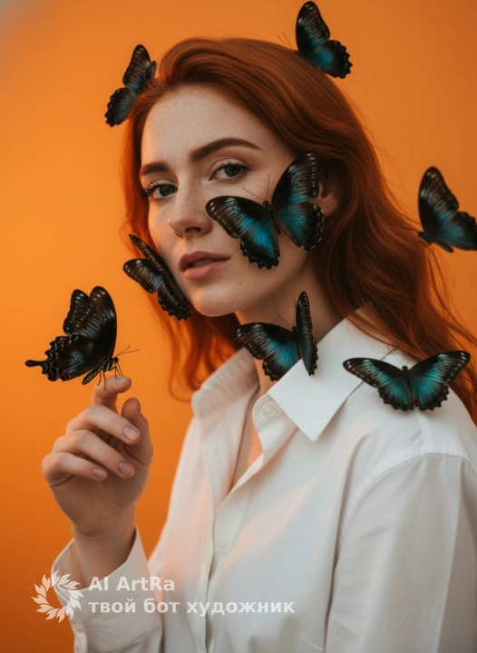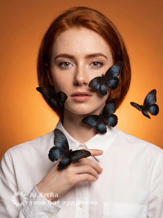 мягкий направленный студийный свет спереди немного сверху, без жёстких теней, лёгкий глянец на крыльях бабочек, тёплые оранжевые рефлексы от фона на коже, насыщенные контрастные цвета, естественный оттенок кожи