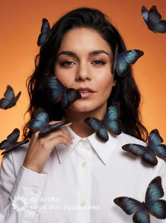 ultra realistic photography, hyper-detailed, 8k, sharp focus on face and butterflies, detailed skin texture, cinematic color grading, professional studio portrait, no artifacts, no distortion