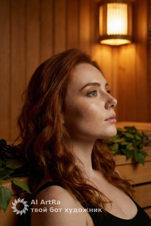 Используйте внешний вид пользователя, референса 1:1 — лицо, кожу, волосы и тело без каких-либо изменений. Женщина в черном купальнике лежит на животе на деревянной скамье в традиционной деревянной бане, голова опирается на сложенные руки, взгляд спокойный и умиротворённый, губы слегка приоткрыты, на лице — естественный, почти незаметный макияж с акцентом на мягком контуре глаз и едва заметном блеске на губах; ногти на руках и ногах короткие, ухоженные, без лака; на запястьях и пальцах — никаких украшений; вокруг тела и под головой — свежие зелёные листья берёзы, создавая ощущение природной свежести и ритуала; фон — тёплые деревянные панели стен и потолка, на заднем плане — висящие пучки сухих трав и веников, а также вертикальный светильник с тёплым янтарным светом; освещение мягкое, боковое, с лёгкими тенями, создающими глубину и уют; цветовая палитра — насыщенные коричневые, зелёные и золотистые оттенки; стиль — гиперреалистичная фотография с кинематографической глубиной резкости; ракурс — средний план, снятый с лёгким наклоном сверху, камера расположена на уровне плеч, фокус на лице и руках; композиция — симметричная, с акцентом на центральную фигуру, линии скамьи и стен ведут взгляд к лицу; атмосфера — расслабленная, медитативная, с ощущением тепла, чистоты и гармонии с природой.