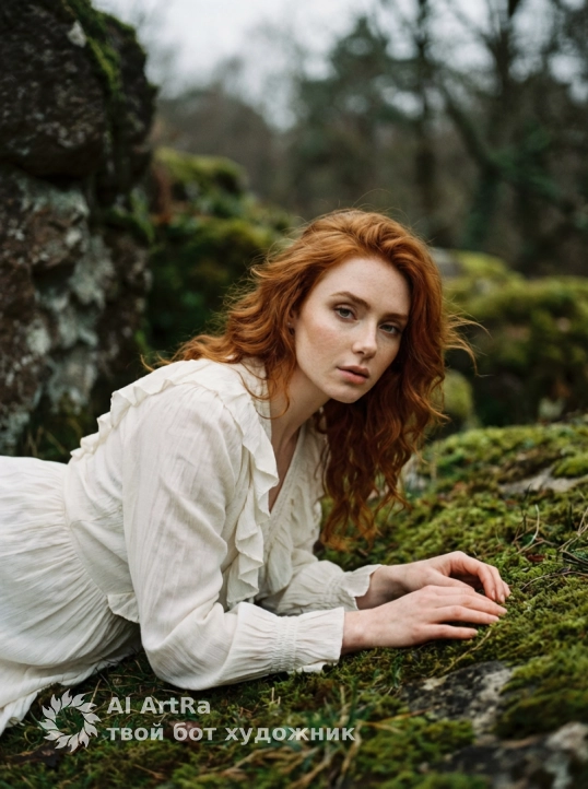 Создай Романтичная, кинематографичная сцена на природе девушки,не меняй черты лица ,в воздушном винтажном белом платье с пышными рюшами и длинными рукавами ,лежит , опершись на локти на мшистом покрытии у каменной скалы,Распущенные,лёгкие волны волос развеваются ветром. Атмосфера пасмурного дня с мягким диффузным светом,глубокая,но спокойная цветовая палитра — приглушённые зелёные, коричневые и теплые тоновые переходы кожи. Низкая перспектива, крупный план по верхней части туловища и рук, малая глубина резкости, красивое боке на фоне скалы и деревьевСтиль — модная редакционная съёмка, натуральный ретро-фильм (мягкая зернистость, слегка пониженная насыщенность, тонкая виньетка)аккуратная цветокоррекция в пастельных тонах