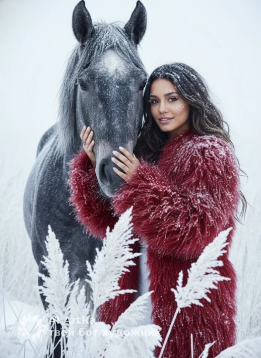 Сгенерируй гиперреалистичную фотографию, основанную на предоставленном референсном изображении. КЛЮЧЕВОЕ УСЛОВИЕ: СОХРАНИТЬ АНАТОМИЧЕСКИЕ ЧЕРТЫ ЛИЦА (ФОРМУ ГЛАЗ, НОСА, ГУБ, ПОДБОРОДКА, СКУЛ) И ФОРМУ ПРИЧЕСКИ (ВОЛОСЫ РАСПУЩЕННЫЕ) С РЕФЕРЕНСНОГО ФОТО БЕЗ ИЗМЕНЕНИЙ. ПОСТАРАТЬСЯ СОХРАНИТЬ ИСХОДНЫЙ МАКИЯЖ НАСТОЛЬКО, НАСКОЛЬКО ЭТО ВОЗМОЖНО, ПРИМЕНИВ ЛЕГКИЙ ЭФФЕКТ ИНЕЯ. Дополнительные детали: Эффекты: Густой налет инея и снега на ресницах, волосах и отдельных участках кожи лица. Обильный слой снега на красной шубке. Одежда: Женщина одета в удлиненную пушистую красную шубку из страуса. Поза и композиция: Портретная съемка до пояса. Расслабленная поза, схожая с референсным фото. Женщина стоит рядом с шикарным темно-серым конем с гривой в инее. Женщина гладит гриву коня, ее рука прижимается к морде коня. Лицо девушки и взгляд обращены в камеру, но при этом ощущается ее близость и контакт с конем. Фон: Холодный, полностью белый иней и снег. На переднем плане, вне фокуса, большой белый ковыль в инее. На заднем плане высокий белый ковыль. Отсутствие любых коричневых или теплых оттенков на фоне. Освещение: Мягкий, диффузный холодный свет под углом 45° слева или справа. Легкое заполнение справа/снизу для смягчения теней на шее и ключевых зонах. Акцент на контурах шеи и волос с помощью фонового источника света. Тонкий глянец на волосах или световой отражатель над головой для дополнительного сияния.
