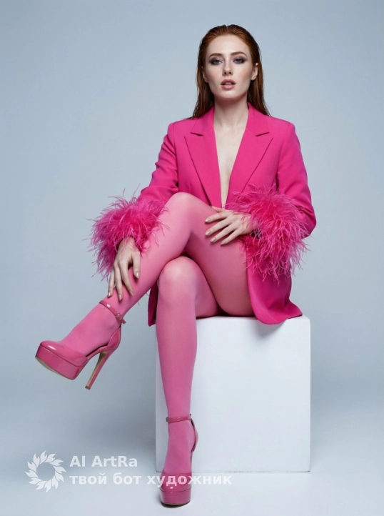 Не меняя внешности женщины с фото, на фоне светло-серого однотонного пространства, она сидит на белом кубе в позе, которая излучает уверенность и женственность. Ее тело слегка повёрнуто вправо, правая нога согнута в колене и подтянута близко к телу, левую ногу она вытягивает в сторону, создавая динамичное и элегантное движение. На ней ярко-розовый пиджак с крупными пушистыми перьевыми украшениями на манжетах, которые придают наряду игривую роскошь, и этот необычный элемент как будто плавно переливается и добавляет текстурного объёма. Пиджак носится без видимой одежды под ним, что подчёркивает изящность линии шеи и ключиц. Ее ноги обтянуты тонкими розовыми колготками, идеально совпадающими по цвету с пиджаком, создавая визуальное продолжение и целостность образа. На ногах — высокие глянцевые розовые платформы с закрытым носом и тонкими ремешками на щиколотках, которые добавляют рост и подчеркивают стройность ног. Руки женщины расположены так, что ладони легко касаются правой ноги, пальцы длинные, ухоженные, с нейтральным маникюром. Лицо чуть повернуто в сторону, взгляд устремлён прямо в камеру, глаза выразительно обрамлены тёмным макияжем, который усиливает их глубину, а губы чуть приоткрыты, создавая мягкое, задумчиво-соблазнительное выражение лица. волосы аккуратно уложены назад, они выглядят слегка влажными или хорошо зачесанными, что придаёт образу глянцевый, эстетически выверенный вид. Все детали освещения, мягко акцентирующие контуры тела и лица, создают ощущение визуальной глубины, а холодный тон фона подчеркивает насыщенную цветовую палитру её наряда и зелёные оттенки глаз. Общая атмосфера снимка напоминает глянцевый модный журнал с акцентом на элегантность и дерзкий шик, погружая зрителя в мир роскоши и стиля, фотореалистичное изображение, высокая текстурная детализация, высокое качество, разрешение 4K.