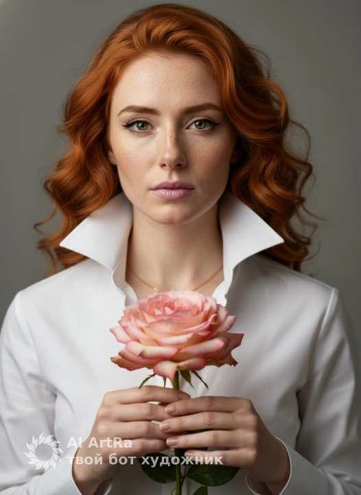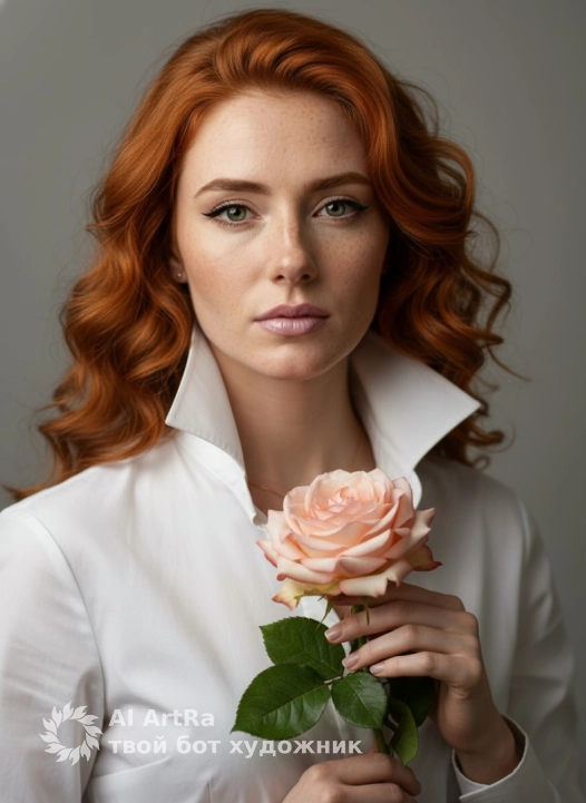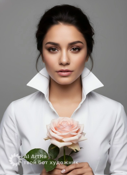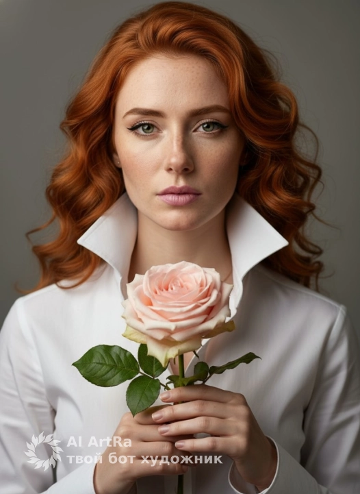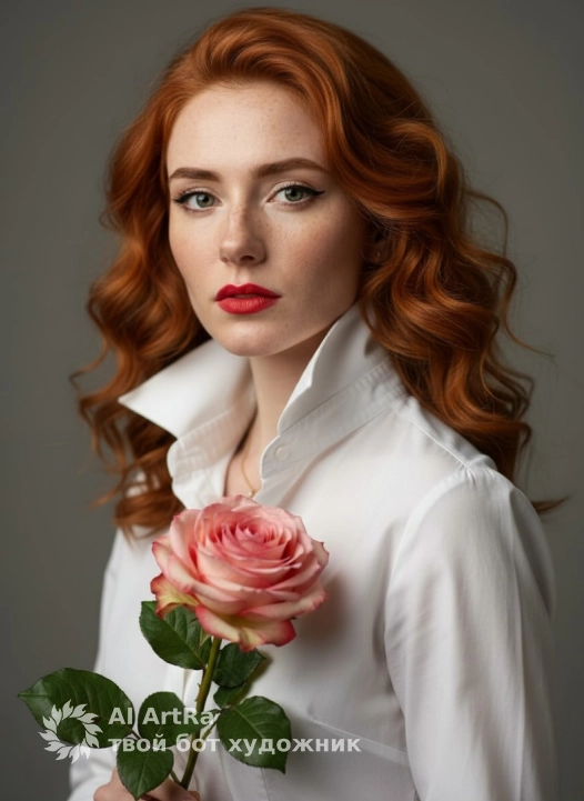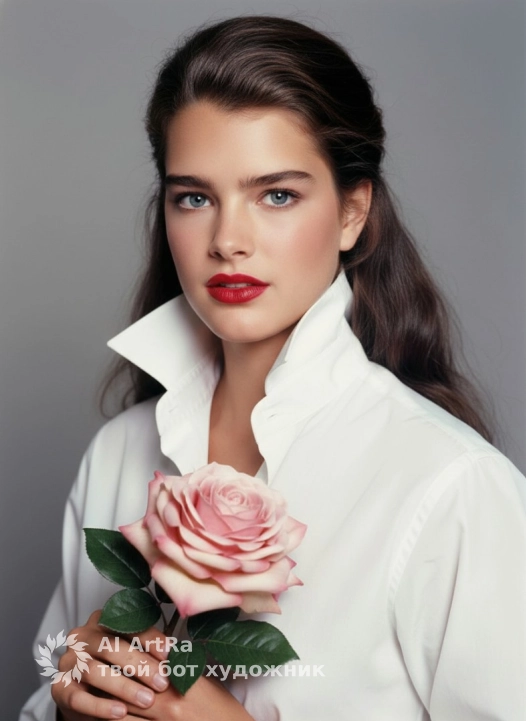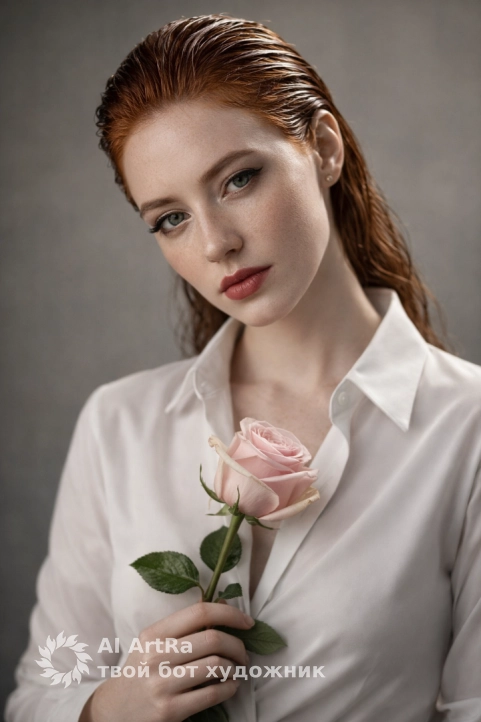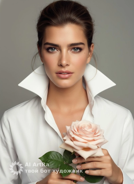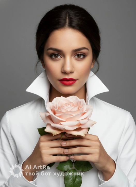 Фотография выполнена в стиле классического студийного портрета. Она передает гармонию между женственностью и внутренней силой. Сочетание белого цвета рубашки и нежной розы создает ощущение чистоты и эстетической завершенности.