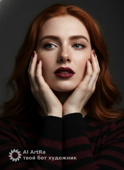 Не меняя внешности женщины с фото, кадр захватывает её лицо крупным планом, подчеркнутым контрастным и ровным светом, исходящим слева, который мягко освещает кожу и создаёт деликатные тени, подчеркивающие рельефные черты лица. Женщина слегка отклоняет голову назад, её глаза направлены немного вверх, привлекая внимание к глубокому взгляду, обрамлённому выразительными бровями и длинными ресницами с лёгким блеском на подвижных веках. Её губы приоткрыты, покрыты насыщенной винной помадой с матовой текстурой, что усиливает драматизм образа. Руки с аккуратным маникюром обрамляют лицо, при этом пальцы нежно касаются верхней и нижней частей головы и шеи, создавая театральную и одновременно интимную позу. Рукава видимой одежды — это узкий узор из черных и бордовых полосок, выполненный из плотной трикотажной ткани, которая добавляет текстурный контраст к бархатистой коже женщины. Фон ровный и темно-серый, что усиливает фокус на модели и создаёт атмосферу сдержанной элегантности и интимности. Композиция тщательно выстроена, игра света и тени добавляет глубину и пространственность кадру, создавая эффект кинематографической изысканности и эмоциональной напряжённости, раскрывая чувственность и внутреннюю силу героя. фотореалистичное изображение, высокая текстурная детализация, высокое качество, разрешение 8K.