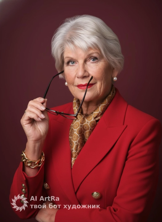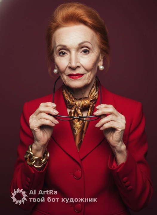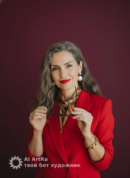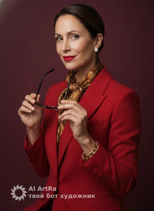 Используйте внешний вид пользователя, референса 1:1 — лицо, кожу, волосы и тело без каких-либо изменений. Женщина в элегантном красном пиджаке с широкими лацканами и пуговицами, держащая в руках черные очки с тонкой оправой, слегка приподнимая их к лицу; на шее — шелковый шарф с золотисто-коричневым узором, на ушах — круглые жемчужные серьги, на запястье — массивный золотой браслет из крупных звеньев; макияж подчеркивает глаза и губы — ярко-красная помада, аккуратно прорисованные брови, легкий блеск на веках; маникюр — нейтральный, аккуратный, без декора; фон — глубокий бордовый, однотонный, без текстур; освещение мягкое, студийное, с легким боковым светом, создающим объем и глубину; стиль — высокий реализм, фотография премиум-класса; композиция — средний план, портретный ракурс, объект расположен центрально, взгляд направлен прямо в камеру с легкой улыбкой; атмосфера — уверенность, элегантность, роскошь, спокойная власть. прическа волосы аккуратно уложены
