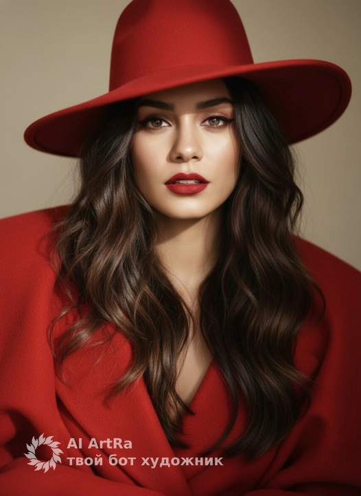 Ultra-realistic high-fashion beauty portrait inspired by Vogue editorial aesthetics. A woman in a dramatic red outfit poses in a close-up shot: bold red lipstick, sharp red eyeliner, flawless glowing skin with natural texture. A wide red hat casts a stylish shadow over part of her face, creating a luxurious contrast of light and soft depth. Rich red fabric details, elegant textures of wool and felt, crisp clean lines, and a confident expressive look. Background minimalistic and neutral to highlight the vibrant red palette. Cinematic soft lighting, shallow depth of field, premium beauty photography style, 8K detail, ultra-sharp eyes, perfect color harmony.
