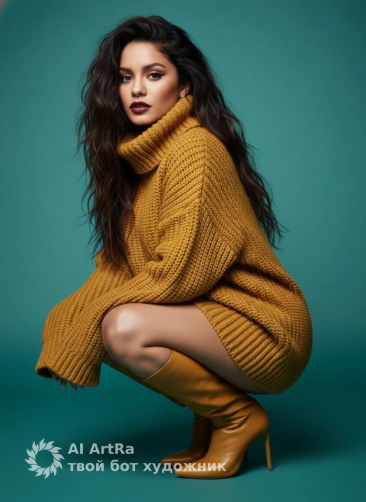 Ultra-realistic cinematic fashion portrait of a woman posing in a bold, confident crouched position against a smooth teal studio background. She wears an oversized mustard-yellow knitted turtleneck sweater with visible thick ribbed texture and matching high-heeled yellow boots made of soft matte leather.