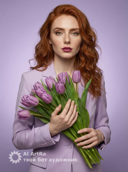 Используйте внешний вид пользователя, референса 1:1 — лицо, кожу, волосы и тело без каких-либо изменений. На изображении — женщина в элегантном пастельно-лиловом костюме из двух частей с застежкой на пуговицы, держащая в обеих руках крупный букет фиолетовых тюльпанов с зелёными стеблями и листьями, слегка наклонённых вперёд; макияж акцентирован на губах тёмно-розовой матовой помадой, брови чётко очерчены, на ушах — небольшие серебристые серьги-гвоздики, на пальцах — натуральный или прозрачный маникюр без декора; фон — однотонный плавный градиент от светло-лилового до сиреневого, освещение мягкое студийное, фронтальное, с лёгким боковым подсветом, создающим нежные тени и объём; стиль — высокий реализм, как профессиональная студийная фотосессия; ракурс — средний план, камера на уровне глаз, композиция симметричная, объект расположен по центру кадра, взгляд направлен прямо в объектив, поза расслабленная, с лёгким наклоном корпуса вперёд, атмосфера — утончённая, спокойная, с ноткой нежности и элегантности.