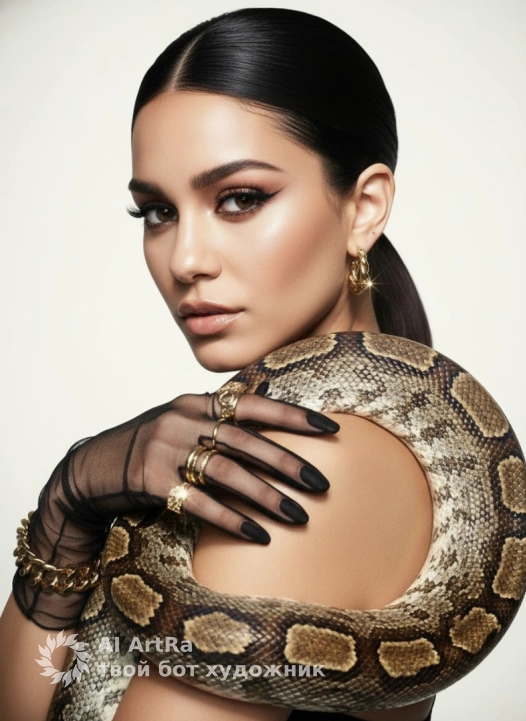 Не меняя внешности женщины с фото, перед нами предстает образ, наполненный загадочностью и утонченностью, словно сцена из современного кинематографа с ярко выраженным акцентом на гламур и драму. Женщина повернута полуобращением к зрителю, ее взгляд устремлен прямо в объектив — в нем читается некая напряженность и глубокая уверенность. Ее кожа сияет гладкой, бархатистой текстурой, подчеркивая точечное направленное освещение, которое акцентирует контуры лица и образует мягкие тени, создающие плавные переходы на щеках и у основания подбородка. Густо накрашенные глаза с четким, графичным подводом, длинными ресницами и выразительными бровями придают взгляду большую выразительность и драматизм. Волосы строго зачёсаны назад, плотно прилегая к голове и собраны в низкий хвост — отдельные пряди неразличимы из-за ракурса и света, что добавляет образу сдержанности и стилистической упорядоченности. На руках женщины надеты тонкие черные перчатки из полупрозрачного материала с деликатной текстурой, которая мягко просвечивает в некоторых местах, играя на пересечениях света и тени. Перчатки подчеркивают изящность и тонкость ее длинных пальцев и украшены массивным золотым браслетом и кольцами, которые сверкают на свету, создавая контраст с общим приглушенным тоном одежды и аксессуаров. На одной из рук плотно обвилась крупная змея с характерным узором, шероховатая чешуя которой отчетливо видна благодаря высокому разрешению и светотени. Змея словно становится продолжением фигуры, ее тело плавно изгибается, создавая динамику в композиции, при этом голова и хвост рептилии видны не полностью — они частично обрезаны кадром. Обратный свет подчеркивает детали ее чешуи, придавая вселенной кадра едва уловимое ощущение таинственности и напряженности. Общий светлый фон и равномерное освещение без жестких теней создают атмосферу воздушности и чистоты, а жесткий световой акцент на лице и руках подчеркивает драматичность и театральность момента. Все детали, от сложной игры света на коже до текстуры ткани перчаток и чешуи змеи, переданы максимально четко и реалистично, создавая глубокое ощущение присутствия именно здесь и сейчас, сдержанную интригу и визуальную гармонию. Это истинно фотореалистичное изображение, высокая текстурная детализация, высокое качество, разрешение 4K.