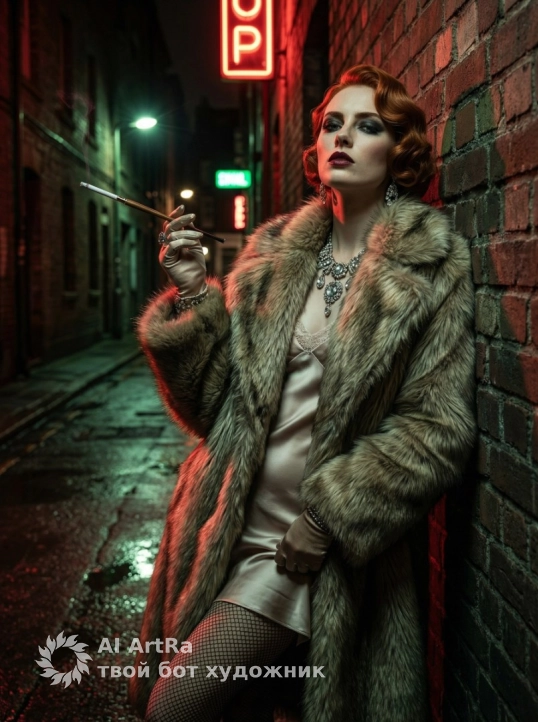 Высокая мода в фотографии, вдохновленная Отто Диксом, ночной жизнью Веймарской республики, гротескным гламуром. Женская модель, прислонившись к грубой кирпичной стене ночью, одета в большую роскошную меховую шубу поверх шелкового платья-комбинации, тяжелые бижутерию, чулки в сеточку. Прическа с волнами, темные smokey eyes, темно-красные губы, фарфоровый цвет кожи. Резкое уличное освещение с неоновыми красными и зелеными акцентами, отражение мокрой улицы. Свирепый и вызывающий взгляд, атмосфера декаданса. Ультрареалистичная фотография 4K, реализм HDR, блеск кожи PBR, нулевое искажение. ––v 6 ––style raw ––q 5 ––ar 1:1 ––ultra-sharp ––hyper-detailed-muscles, skin, Hair, fabric, surrounding, ratio 3:4. Снято на месте, невероятно детализировано. Снято профессиональным фотографом-документалистом и его командой с помощью Phase One XF IQ4 150MP, сенсор 151 MP.Чрезвычайно строгое правило: необходимо подчеркнуть художественный дизайн и перспективу, никаких парящих лиц, никаких невозможных положений или поз.Чрезвычайно строгое правило: 100% HDR REALISM 100% гиперреалистичность.Чрезвычайно строгое правило: девушки-модели должны позировать точно так, как описано.Чрезвычайно строгое правило: девушки-модели должны на 100% соответствовать исходному изображению. Не допускается изменение глаз, носа и рта.Чрезвычайно строгое правило: прически должны быть точно такими, как описано.Чрезвычайно строгое правило: соотношение сторон (AR) должно быть точно таким, как описано.Чрезвычайно строгое правило: необходимо следовать каждому слову в этом описании для 100% точной эстетики. Никаких именных бирок. Никакого текста. Негативный промпт: мягкое освещение, пастельные цвета, невинный взгляд