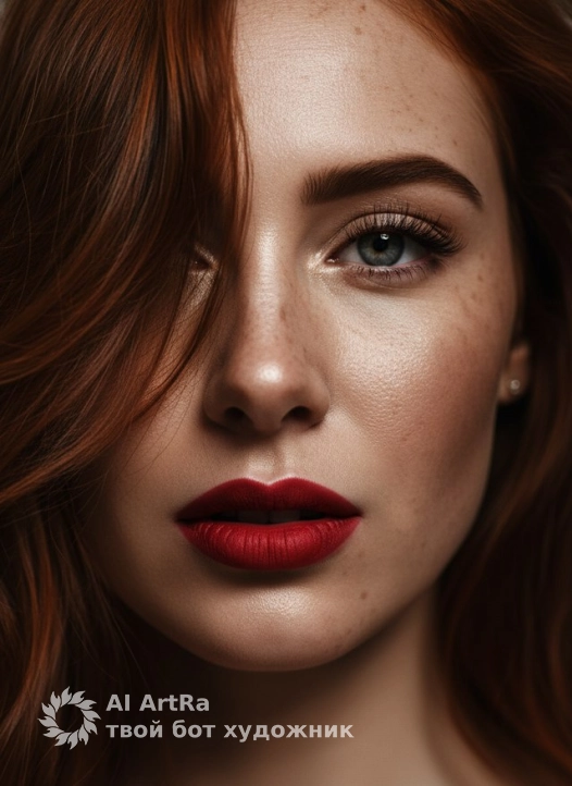 Не изменяя черты лица, сохранение сходства 100%. Крайне крупный план портрета гламурной женщины с загорелой кожей, полными красными матовыми губами, серыми глазами и длинными ресницами, ее лицо без блеска, сияющая текстура кожи, острый фокус на глазах и губах, матовый макияж, высокие скулы, тонкий контур, элегантное освещение с сильным контрастом, кинематографическая красота редакторского стиля, темный фон, насыщенная глубина цвета, резкий 85-миллиметровый объектив, фотореалистичный вид. Вблизи видна только часть ее лица, часть лица закрывают волосы. –ar 9:16 –ow 300 –style raw –stylize 550