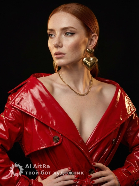 Не меняя внешности женщины с фото, кадр запечатлевает её в полуобороте, слегка обращённой влево, с уверенной позой и руками, сложенными на талии. Она одета в ярко-красный плащ с эффекта глянцевой поверхности, который придаёт образу динамику благодаря блестящим переливам света на ткани. Верхняя часть плаща элегантно опущена на плечи, открывая зону декольте и подчёркивая тонкость шеи. Освещение мягко направлено спереди и немного сверху, создавая выразительные тени на лице, подчёркивающие скулы и плавные контуры, а золотистый цвет украшений — массивных серёжек в форме сердца и цепочки — привлекает взгляд, гармонично сочетаясь с теплым тоном кожи. Волосы гладко уложены назад, но детали их текстуры и длины неразличимы из-за затемнённого фона, который полностью исчезает в глубоком, равномерном черном пространстве, добавляя драматизма и подчёркивая центральную фигуру. Взгляд женщины направлен прямо в камеру, выражая спокойствие и лёгкую загадочность, а макияж с выразительной чёрной подводкой глаз и естественными оттенками губ придаёт лицу эффектный шарм. Ногти аккуратно покрыты красным лаком, что создаёт завершённость образа, на фоне отсутствия дополнительных аксессуаров, что усиливает акцент на лице и одежде. Композиция выдержана в тонком балансе светотени и насыщенных красных и золотых тонов, создающих атмосферу гламура и элегантной сдержанности, чётко передавая глубину и текстуру материалов, а также тонкую игру света и тени на коже и ткани, фотореалистичное изображение, высокая текстурная детализация, высокое качество, разрешение 8K.