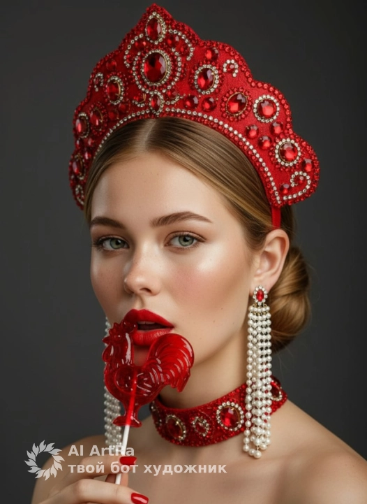 На голове кокошник красный усыпанный красными стразами и камнями, широкий красный чокер, инкрустированный красными бусинами, длинные серьги-подвески, состоящие из каскадов жемчужных бусин. Ногти насыщенно красные квадратной формы. Мягкое студийное освещение, высокая детализация, глянцевая кожа, модная фотография, высокая мода. Стиль: провокационный, ретро-шик, высокая детализация.