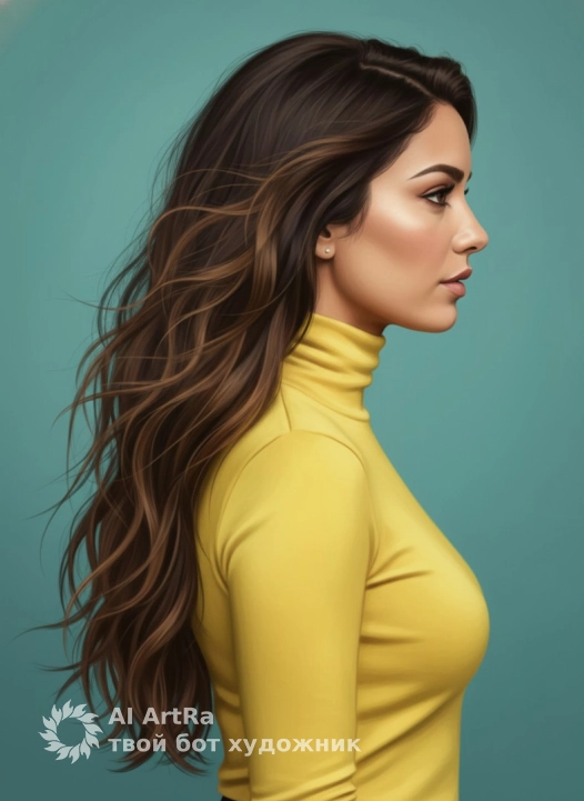 High-fashion profile portrait, capturing the elegant line of her face and flowing hair. Yellow turtleneck sweater frames the neck. Teal studio backdrop softly illuminated, artistic composition, haute couture editorial mood.