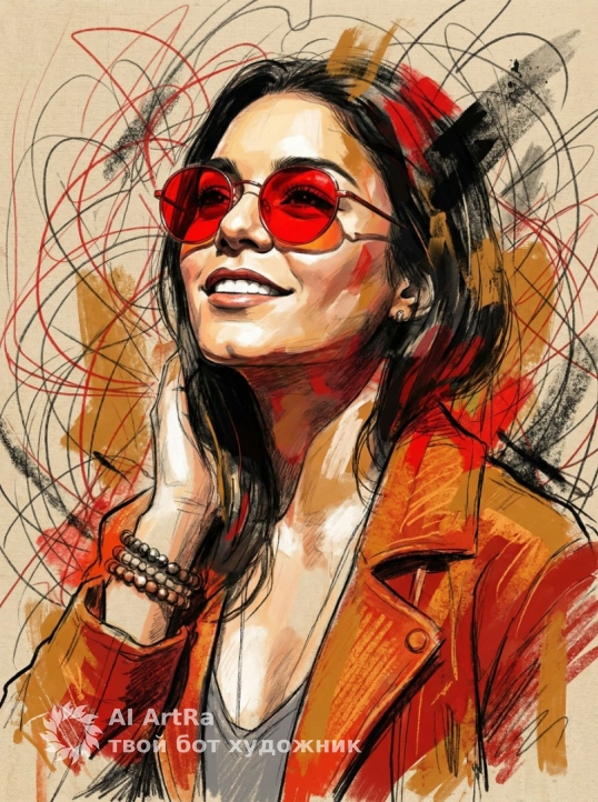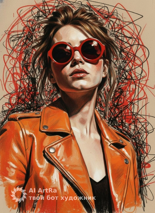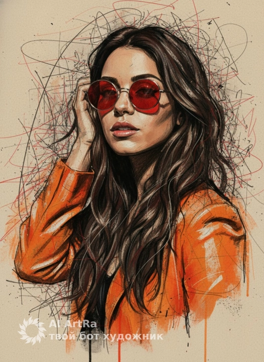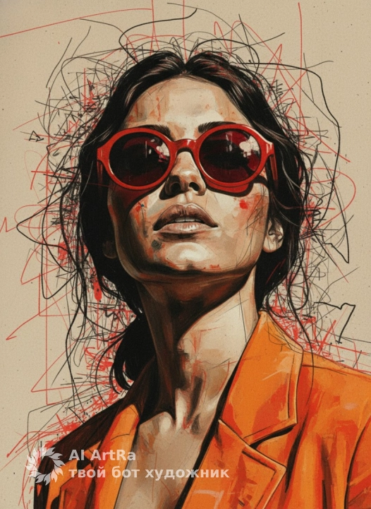Generate an image from the uploaded photo as a bold abstract portrait of a confident woman wearing vibrant red round sunglasses and an orange jacket. Blend sketch-like pencil lines with expressive paint strokes, mixing realism and abstraction. Use a textured beige canvas background with chaotic red and black linear patterns to convey artistic energy and rebellion. Apply dramatic lighting to highlight the face with deep shadows and a strong upward perspective, emphasizing strength and individuality. Style the image as modern mixed-media art with a grunge aesthetic, high detail, cinematic composition, and poster-ready design.