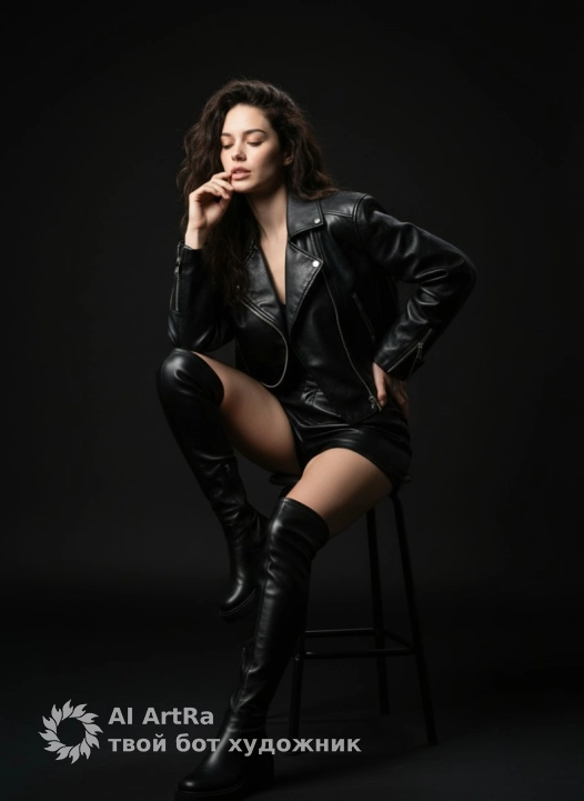 A stunning young woman with my hair, sitting confidently on a simple black stool in a dark studio. She is wearing a stylish, oversized black leather jacket with visible zippers and pockets, paired with high-waisted black leather shorts and thigh-high black leather boots. Her pose is sensual and relaxed: one leg is bent with the knee raised, her hand rests gently under her chin, fingers lightly touching her lips, while the other hand rests on her hip. Her eyes are closed or looking down with a dreamy, contemplative expression. The lighting is dramatic chiaroscuro — strong directional light from the side illuminates her face, shoulder, and thigh, casting deep shadows across the rest of her body and the background. The background is a solid, dark gray or black, completely plain to emphasize the subject. The overall mood is moody, sophisticated, and edgy, with a focus on texture, contrast, and feminine allure. High detail, photorealistic, 8K resolution. Не изменяй особенности моей внешности