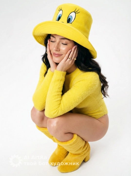 Ultra-realistic fashion portrait inspired by Tweety cartoon aestheticsFace: keep the same woman’s face from the uploaded reference image, natural proportions, playful expression with eyes gently closed.Pose: squatting down sideways, body turned slightly at an angle, elbows resting on knees, hands pressed softly against her cheeks, confident yet playful body language.Outfit: fuzzy bright yellow long-sleeve body, minimal bottoms for bold editorial look, and tall fuzzy yellow boots.Headwear: bright yellow oversized bucket hat (panama style) with large cartoon Tweety eyes on the front.Accessories: wavy hair, glossy makeup in natural tones, stylish manicure with rings.Background: seamless white studio backdrop, clean and minimalistic.Lighting: bright, even studio light, smooth shadows highlighting texture of fuzzy fabric and glowing skin.Mood: bold, fun, editorial, fashion-forward with playful cartoon-inspired energy.Camera / Angle: slightly high-angle shot, camera positioned a bit above eye-level, tilted gently downward. Subject posed at a three-quarter angle (not fully frontal). Medium-full framing from head to knees, using 50mm prime lens for natural proportions and soft depth.Composition: centered framing, ultra-detailed 8K texture, vivid yellow color accuracy.