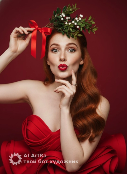 In her raised hand above her head, she is holding a small decorative branch with green leaves and white berries, tied together with a satin red ribbon formed into a bow. The branch partially covers one side of her forehead and eye area, creating a festive and stylized composition. Her nails are manicured in a light, neutral shade, and she is wearing multiple rings on her fingers.