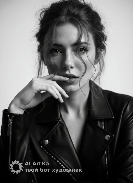 She raises one hand near her lips, lightly touching them with her fingers in a sensual, delicate gesture. Her other arm is bent and partially visible in the bottom left corner, covered by a black leather jacket sleeve. She wears a black leather jacket that appears in the foreground, creating depth and framing the lower part of the image.