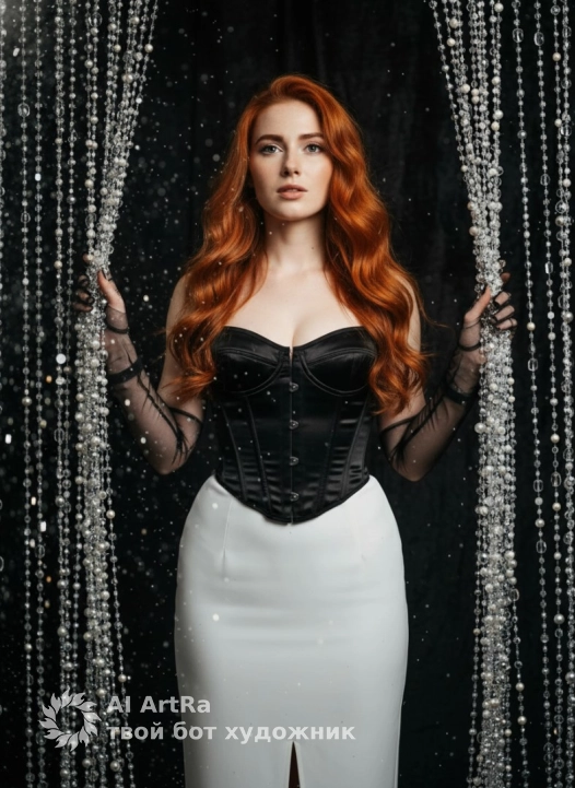 Не меняя внешности женщины с фото, перед нами предстает изысканная дамская фигура, эффектно позирующая в центре кадра на фоне темной, почти бархатной, глубокой тьмы. Ее взгляд направлен чуть выше уровня камеры, создавая ощущение уверенности и лёгкой задумчивости, а россыпь серебристых и жемчужных бусин, образующих занавес, окружает ее своей сверкающей аурой, добавляя сцене гламурного блеска и воздушной оригинальности. Женщина одета в контрастное сочетание — черный корсет из блестящей ткани с четко очерченными швами и застежкой спереди, подчеркивающий талию и изящную линию груди, и белую юбку с высокой посадкой, выполненную из гладкого материала с небольшим разрезом по центру, придающим образу лёгкую дерзость и утонченную элегантность. На руках у нее прозрачные черные перчатки из тончайшей сетки, покрывающей запястья и предплечья, которую тонко выделяет мягкий свет, играющий на текстуре материала. Длинные локоны волос, слегка волнистые, свободно спадают на плечи, обрамляя лицо с аккуратным макияжем: сияющими тенями на веках и естественным тоном губ, что гармонично вписывается в общую атмосферу утонченной роскоши и приглушенной яркости. Фон, украшенный вертикальными цепочками сверкающих бусин и кристаллов, отражающих свет в множества сияний и бликов, создает глубину и чувственность, а мягкие отблески подчеркивают объемность композиции и располагают к внимательному изучению деталей. Вся сцена наполнена тонкой игрой света и тени, придающей портрету кинематографичную выразительность, где одежда и аксессуары подчеркивают не только изящные формы, но и характер, не разрушая естественной эстетики модели, сделав образ одновременно дерзким и благородным, с легкой загадочностью, сохраняя тем самым индивидуальность и жизненную силу женщины, сохранившей свою аутентичность, фотореалистичное изображение, высокая текстурная детализация, высокое качество, разрешение 4K.