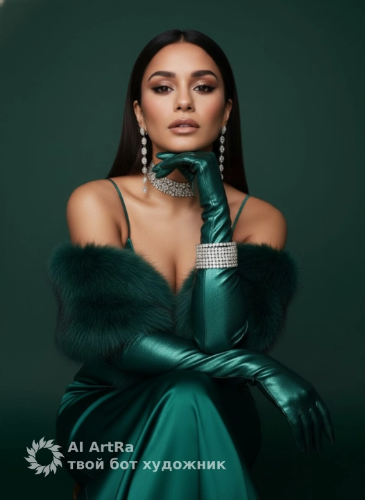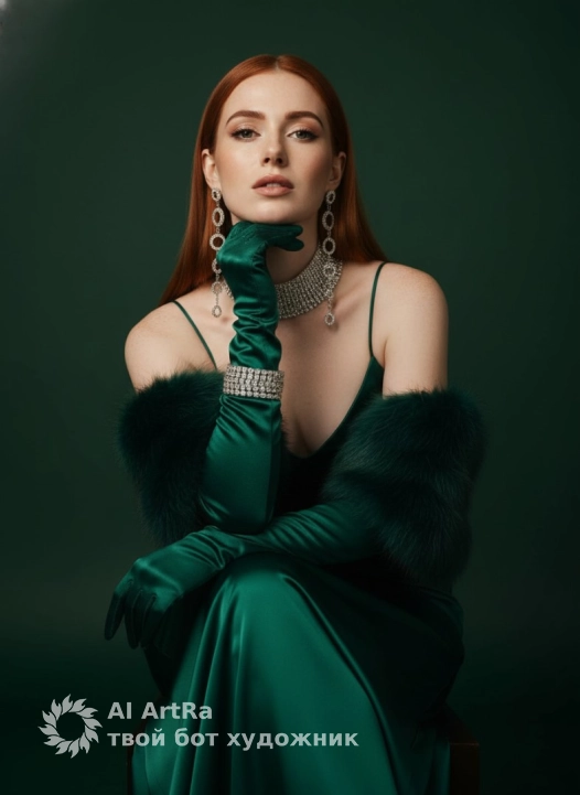 На изображении изображена женщина в элегантном вечернем образе с акцентом на изысканность, контраст и утончённую гармонию деталей. Она сидит, слегка наклонив голову и опершись рукой о подбородок, взгляд направлен прямо вперёд — уверенный, выразительный и спокойный. На ней длинное платье из гладкого атласного материала глубокого изумрудного оттенка с тонкими бретелями, мягко подчёркивающее линии плеч и декольте. Поверх платья — накидка или манжеты из густого искусственного меха в тон, создающие ощущение роскоши и мягкости.