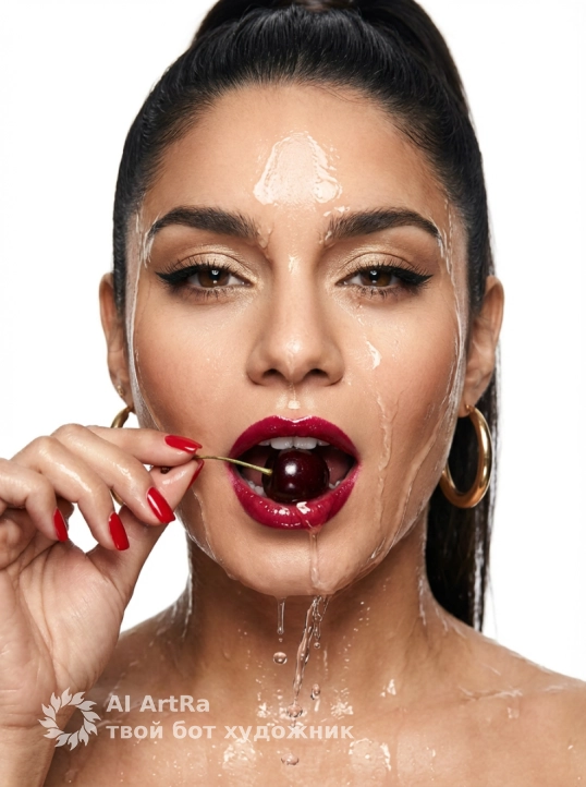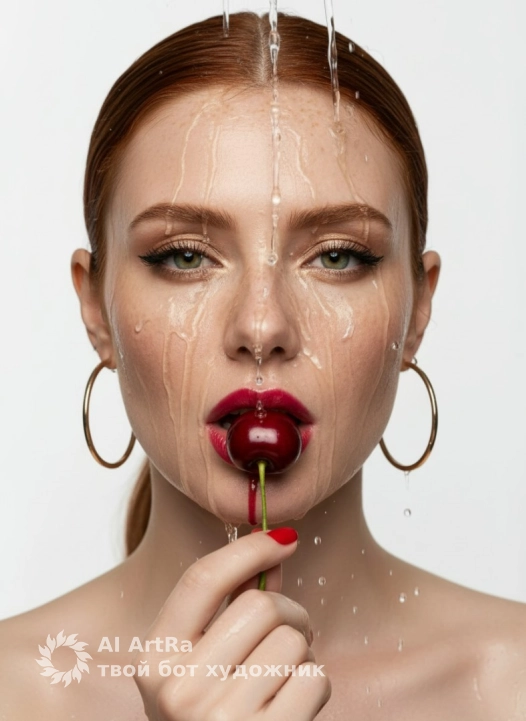 Гиперреалистичный бьюти-портрет крупным планом. девушка с смотрит в камеру, чувственно кусает спелую вишню, которую держит за веточку. В кадре только лицо С ягоды по губам стекает прозрачная капля сока. Макияж: глянцевая рубиново-красная помада на пухлых губах, сияющие золотисто-бежевые тени, четкие черные стрелки и длинные ресницы. Короткие квадратные ногти с ярко-красным маникюром.