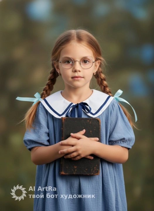 Не меняя внешности девочки с фото, образ создаёт атмосферу умиротворённого классического портрета с мягким, рассеянным освещением, подчеркивающим её нежную кожу и выражение лица. Девочка стоит фронтально, смотрит прямо в камеру, глаза широко раскрыты и спокойны, что придаёт кадру глубину и невинность. Её светло-коричневые волосы заплетены в две короткие косички, каждая из которых украшена светло-голубой лентой, активно развевающейся в стороны и создающей ощущение лёгкого движения. На ней лёгкое голубое платье с короткими рукавами, выполненное из фактурного материала, похожего на тонкий муслин или батист, с большим воротником, украшенным тёмно-синей лентой, завязанной бантом у горловины. Платье сидит свободно, струящийся материал создаёт ощущение нежности и детской простоты. Маленькие ручки девочки крепко и бережно прижимают к груди старую книгу с тёмной кожаной обложкой, на которой видны естественные потертости и текстура времени, добавляющие сюжету ощущение истории и уюта. Стильные крупные круглые очки в тонкой металлической оправе подчёркивают интеллигентный и серьёзный характер портрета, добавляя образу лёгкую ретро-нотку. Фон размыт, с приглушёнными зелёно-коричневыми и голубыми оттенками, создавая мягкий, гармоничный контраст с платьем и лицом ребёнка, и усиливает ощущение камерной и спокойной атмосферы. Тени формируются мягко, естественно обрисовывая объёмы и создавая кинематографичное ощущение глубины и объёма, при этом освещение идёт равномерно с лёгким направлением слева, подчёркивая нежный румянец на щёчках девочки. Весь образ словно наполнен лёгкой мечтательностью и искренностью, раскрывая момент детской сосредоточенности и внутреннего мира. фотореалистичное изображение, высокая текстурная детализация, высокое качество, разрешение 8K.