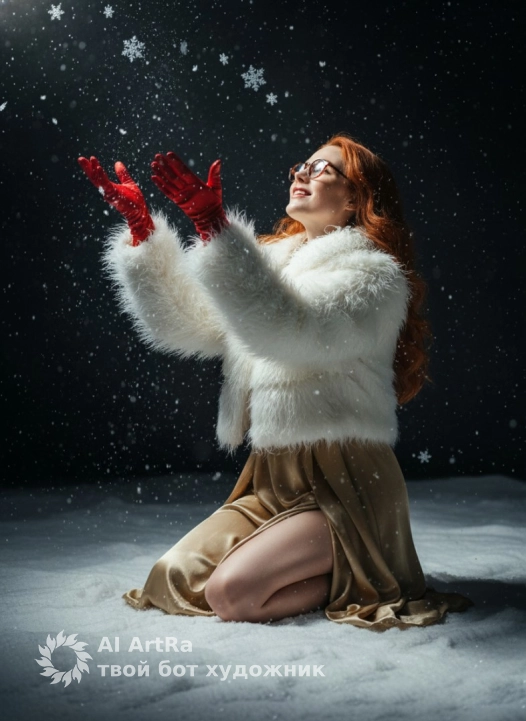 Не меняя внешности женщины с фото, сцена наполнена атмосферой чарующего зимнего волшебства, где мягкий свет прожектора выделяет её на глубоком тёмном фоне, создавая эффект театральной постановки. Женщина находится на коленях на белоснежном покрытии, имитирующем снег, её тело повернуто в три четверти вправо, голова слегка запрокинута назад, лицо устремлено вверх с улыбкой и выражением лёгкого изумления и радости. Она одета в роскошный белый пуховый жакет с длинным пушистым ворсом, который переливается в свете, создавая нежную текстуру шерсти. Под ним видно блестящее золотистое платье из струящегося атласа, мягко оборачивающее её тело, с складками, которые ловят свет, подчёркивая лаконичность ткани. Руки женщины подняты вверх, правая из них застёгнута в ярко-красную атласную перчатку, ладонь распахнута и тянется к падающим крупному снегу, которые затемнены контрастом и объёмно разбросаны по всему кадру. Левая рука частично обрезана кадром, но видно, что она тоже украшена подобной перчаткой. Ноги загнуты назад, с видимыми голыми бедрами и тонкими линиями ног в темноте, тени с резко прорисованными контурами отбрасываются на снежный пол, подчёркивая пластичность позы. Вся композиция строится вокруг чувства ожидания и магии зимней ночи, подчёркнутой приглушёнными тенями и мягким светом, что придают изображению интимность и драматизм. Снег словно парят в воздухе, делая кадр живым и наполненным движением, в то время как выражение женщины передаёт восхищение и безмятежность момента. Внимание к деталям тканей, игре света и теней создаёт богатую, многослойную визуальную текстуру. Всё вместе формирует настроение изящной зимней сказки, буквально сияющей холодным серебристым светом на фоне бесконечной тьмы, фотореалистичное изображение, высокая текстурная детализация, высокое качество, разрешение 4K.
