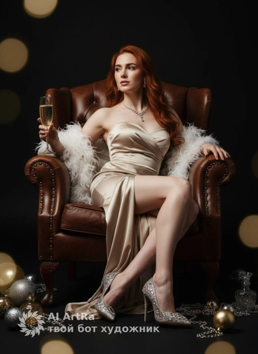 Используйте внешний вид пользователя, референса 1:1 — лицо, кожу, волосы и тело без каких-либо изменений. Элегантная женщина в роскошном черном атласном платье без бретелей с высоким разрезом, обрамленном белой пушистой накидкой на плечах, позирует в массивном коричневом кожаном кресле с декоративными гвоздиками и деревянными ножками, держа в руке хрустальный бокал с шампанским, нога в изысканных туфлях с кристаллами слегка вытянута вперед, создавая динамику. Фон — глубокий черный, подчеркивающий контраст с блестящими серебряными и золотыми новогодними шарами на полу, разбросанными вокруг кресла, а также с мелкими деталями вроде цепочек и стеклянных сосудов. Стиль — гиперреалистичная фотография с драматическим боке, мягким боковым освещением, акцентирующим блики на драгоценных камнях ожерелья и серьгах, создавая атмосферу праздничной роскоши и уверенной грации. Композиция кадра фокусируется на центральной фигуре с низким ракурсом, усиливающим впечатление величия, при этом каждая деталь, от текстуры атласа до перелива шампанского в бокале, проработана с кинематографической точностью, передавая ощущение теплого, интимного вечера, насыщенного шиком и тайной.