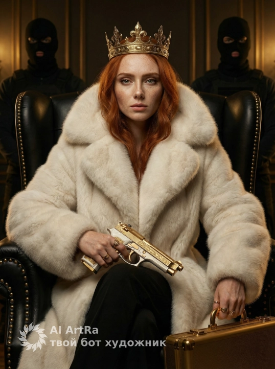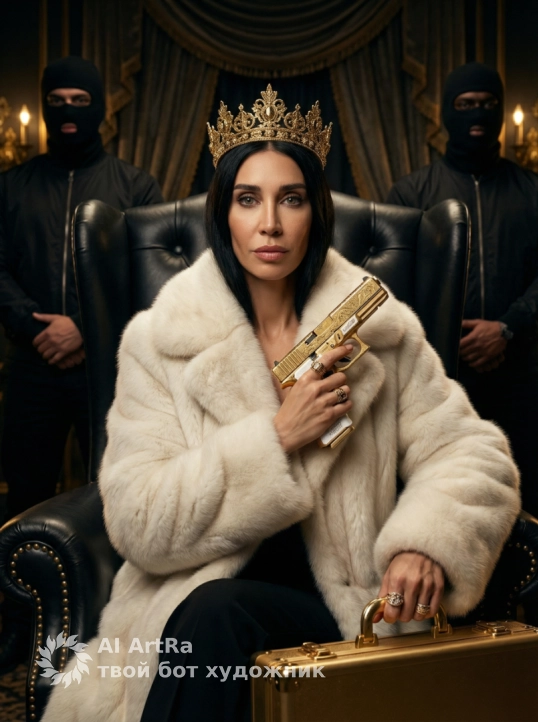 Создай портрет, не меняй черты лица. Роскошная королева с золотой короной волнистыми волосами и в белой пушистой оверсайз норковой шубе с меховым воротником. Она сидит на роскошном черном кожаном троне/кресле с заклепками. Женщина держит в одной руке два декоративных пистолета (скорее всего, Glock или Beretta) с золотой гравировкой и белыми рукоятками. А во второй золотой чемодан , кольца на пальцах. За ней, по бокам, стоят два телохранителя в черных масках-балаклавах и черной одежде. Атмосфера преступной роскоши, богатое темное окружение, приглушенный золотой свет. Высокое качество, кинематографический свет, гиперреализм, 8k.